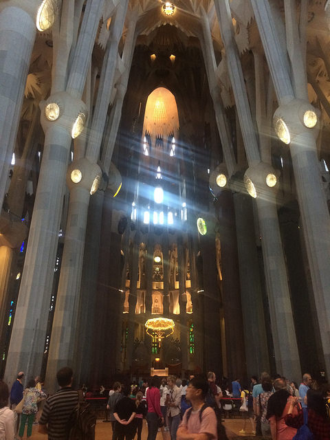 When we did eventually get inside I had initially ignored the signs and suggestions for filing umbrellas away in the plastic bags that were provided. Above me were brilliantly colored stained glass windows mounted into the walls of the tallest church in the world. We spotted the detail of the roof in the nave, and marveled at all the different lights and colors that filled the Spanish Gothic/Art Nouveau masterpiece.